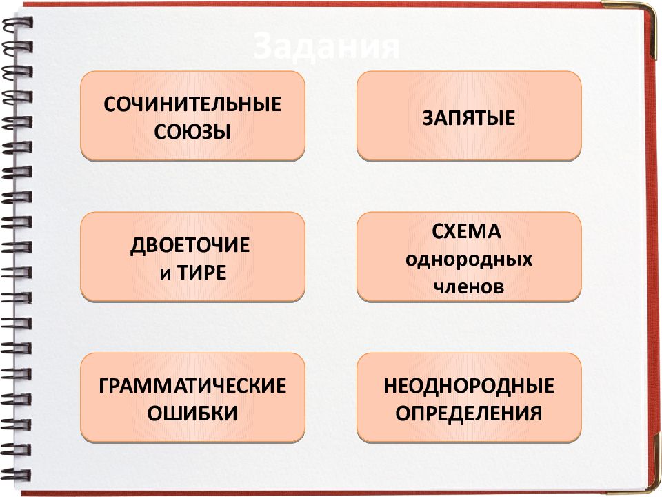 СХЕМА однородных членов Задания СОЧИНИТЕЛЬНЫЕ СОЮЗЫ ЗАПЯТЫЕ ДВОЕТОЧИЕ и ТИРЕ ГРАММАТИЧЕСКИЕ ОШИБКИ НЕОДНОРОДНЫЕ ОПРЕДЕЛЕНИЯ