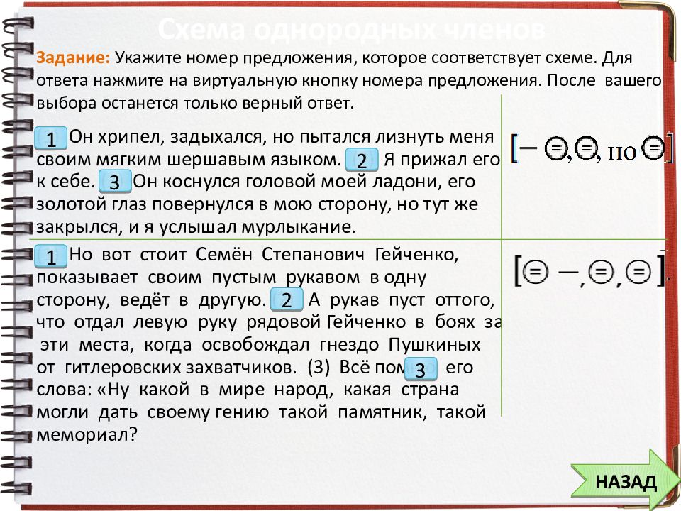 (1) Но вот стоит Семён Степанович Гейченко, показывает своим пустым рукавом в одну сторону, ведёт в другую. (2) А рукав пуст оттого, что отдал левую руку рядовой Гейченко в боях за эти места, когда освобождал гнездо Пушкиных от гитлеровских захватчиков. (3) Всё помню его слова: «Ну какой в мире народ, какая страна могли дать своему гению такой памятник, такой мемориал ? Схема однородных членов Задание: Укажите номер предложения, которое соответствует схеме. Для ответа нажмите на виртуальную кнопку номера предложения. После вашего выбора останется только верный ответ. ( 1) Он хрипел, задыхался, но пытался лизнуть меня своим мягким шершавым языком. (2) Я прижал его к себе. (3) Он коснулся головой моей ладони, его золотой глаз повернулся в мою сторону, но тут же закрылся, и я услышал мурлыкание. 3 2 1 2 3 1 НАЗАД