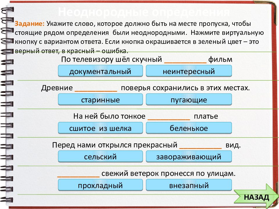 Задание: Укажите слово, которое должно быть на месте пропуска, чтобы стоящие рядом определения были неоднородными. Нажмите виртуальную кнопку с вариантом ответа. Если кнопка окрашивается в зеленый цвет – это верный ответ, в красный – ошибка. документальный неинтересный НАЗАД По телевизору шёл скучный __________ фильм старинные пугающие Древние __________ поверья сохранились в этих местах. сшитое из шелка беленькое На ней было т онкое __________ платье сельский завораживающий Перед нами открылся прекрасный __________ вид. п рохладный внезапный __________ свежий ветерок пронесся по улицам.
