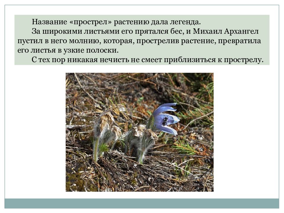Название «прострел» растению дала легенда. За широкими листьями его прятался бес, и Михаил Архангел пустил в него молнию, которая, прострелив растение, превратила его листья в узкие полоски. С тех пор никакая нечисть не смеет приблизиться к прострелу.