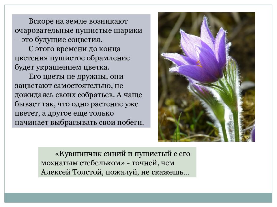 Вскоре на земле возникают очаровательные пушистые шарики – это будущие соцветия. С этого времени до конца цветения пушистое обрамление будет украшением цветка. Его цветы не дружны, они зацветают самостоятельно, не дожидаясь своих собратьев. А чаще бывает так, что одно растение уже цветет, а другое еще только начинает выбрасывать свои побеги. «Кувшинчик синий и пушистый с его мохнатым стебельком» - точней, чем Алексей Толстой, пожалуй, не скажешь…