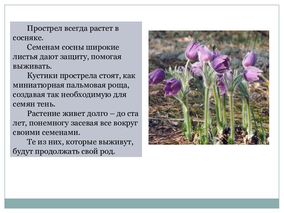 Прострел всегда растет в сосняке. Семенам сосны широкие листья дают защиту, помогая выживать. Кустики прострела стоят, как миниатюрная пальмовая роща, создавая так необходимую для семян тень. Растение живет долго – до ста лет, понемногу засевая все вокруг своими семенами. Те из них, которые выживут, будут продолжать свой род.