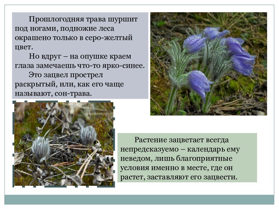 Прошлогодняя трава шуршит под ногами, подножие леса окрашено только в серо-желтый цвет. Но вдруг – на опушке краем глаза замечаешь что-то ярко-синее. Это зацвел прострел раскрытый, или, как его чаще называют, сон-трава. Растение зацветает всегда непредсказуемо – календарь ему неведом, лишь благоприятные условия именно в месте, где он растет, заставляют его зацвести.
