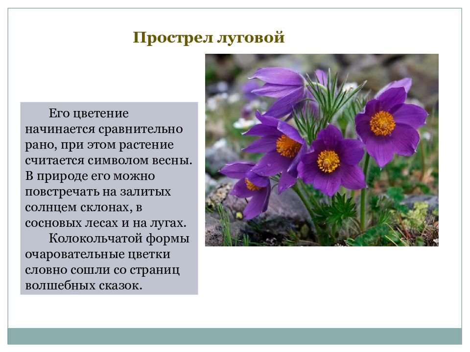 Последний слайд презентации: Прострел луговой Его цветение начинается сравнительно рано, при этом растение