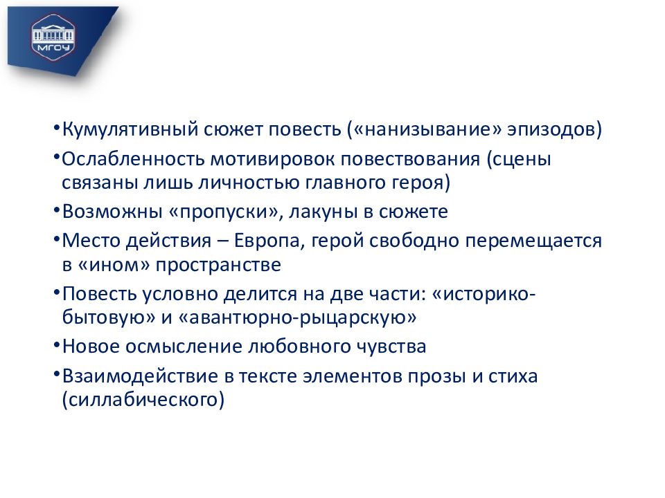 Кумулятивный сюжет повесть («нанизывание» эпизодов) Ослабленность мотивировок повествования (сцены связаны лишь личностью главного героя) Возможны «пропуски», лакуны в сюжете Место действия – Европа, герой свободно перемещается в «ином» пространстве Повесть условно делится на две части: «историко-бытовую» и «авантюрно-рыцарскую» Новое осмысление любовного чувства Взаимодействие в тексте элементов прозы и стиха (силлабического)
