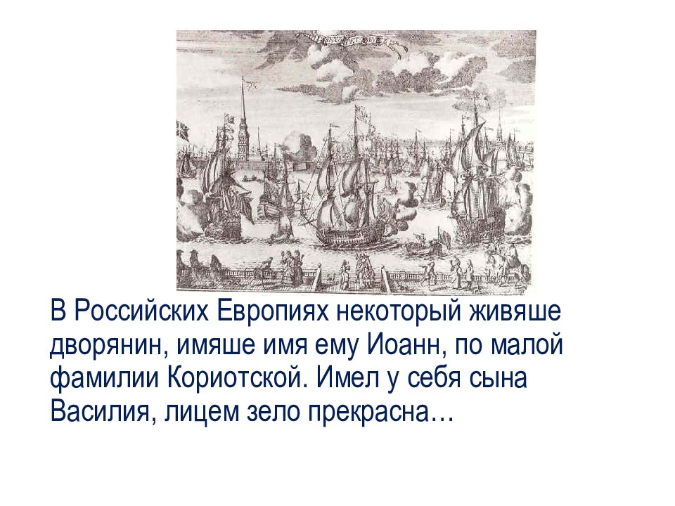 В Российских Европиях некоторый живяше дворянин, имяше имя ему Иоанн, по малой фамилии Кориотской. Имел у себя сына Василия, лицем зело прекрасна…