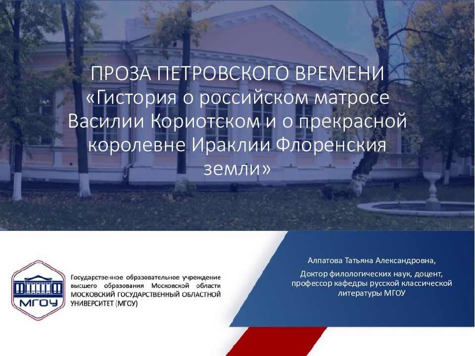 Первый слайд презентации: ПРОЗА ПЕТРОВСКОГО ВРЕМЕНИ « Гистория о российском матросе Василии Кориотском и о прекрасной королевне Ираклии Флоренския земли»