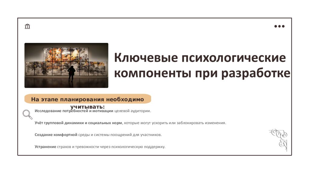 Ключевые психологические компоненты при разработке Исследование потребностей и мотивации целевой аудитории. Учёт групповой динамики и социальных норм, которые могут ускорить или заблокировать изменения. Создание комфортной среды и системы поощрений для участников. Устранение страхов и тревожности через психологическую поддержку. На этапе планирования необходимо учитывать: