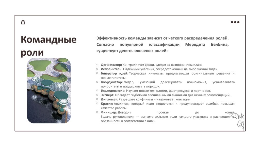 Командные роли Организатор: Контролирует сроки, следит за выполнением плана. Исполнитель: Надежный участник, сосредоточенный на выполнении задач. Генератор идей: Творческая личность, предлагающая оригинальные решения и новые гипотезы. Координатор: Лидер, умеющий делегировать полномочия, устанавливать приоритеты и поддерживать порядок. Исследователь: Изучает новые технологии, ищет ресурсы и партнеров. Эксперт: Обладает глубокими специальными знаниями для ценных рекомендаций. Дипломат: Разрешает конфликты и налаживает контакты. Критик: Аналитик, который ищет недостатки и предупреждает ошибки, повышая качество работы. Финишер: Доводит проекты до конца. Задача руководителя — выявить сильные роли каждого участника и распределить обязанности в соответствии с ними. Эффективность команды зависит от четкого распределения ролей. Согласно популярной классификации Мередита Белбина, существует девять ключевых ролей: