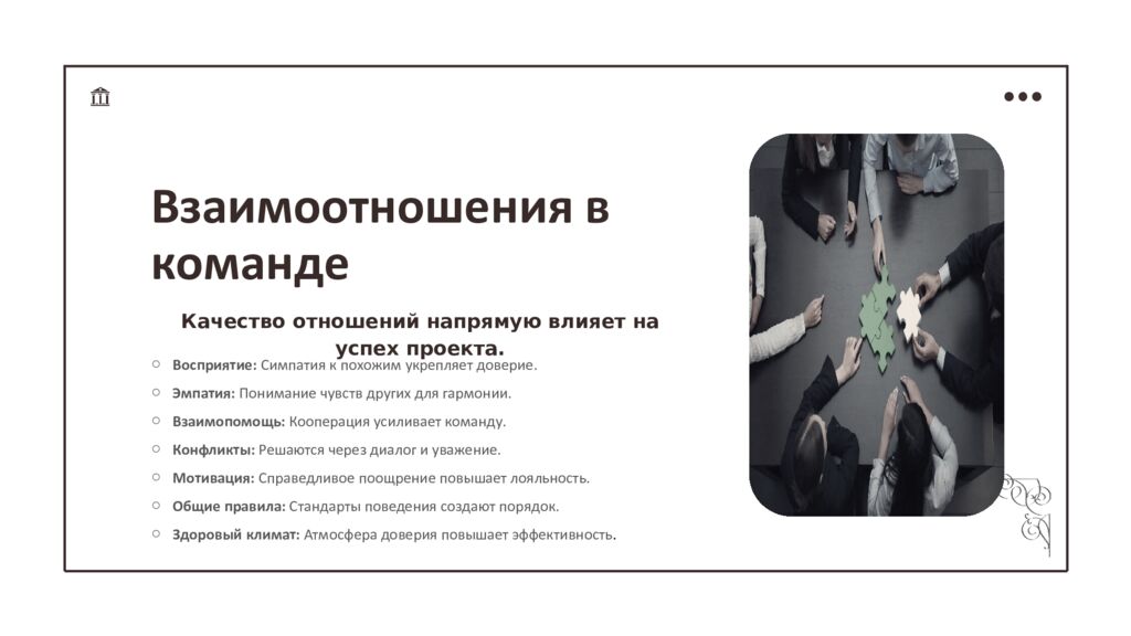 Взаимоотношения в команде Восприятие: Симпатия к похожим укрепляет доверие. Эмпатия: Понимание чувств других для гармонии. Взаимопомощь: Кооперация усиливает команду. Конфликты: Решаются через диалог и уважение. Мотивация: Справедливое поощрение повышает лояльность. Общие правила: Стандарты поведения создают порядок. Здоровый климат: Атмосфера доверия повышает эффективность. Качество отношений напрямую влияет на успех проекта.