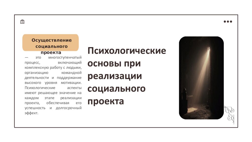 — это многоступенчатый процесс, включающий комплексную работу с людьми, организацию командной деятельности и поддержание высокого уровня мотивации. Психологические аспекты имеют решающее значение на каждом этапе реализации проекта, обеспечивая его успешность и долгосрочный эффект. Психологические основы при реализации социального проекта Осуществление социального проекта