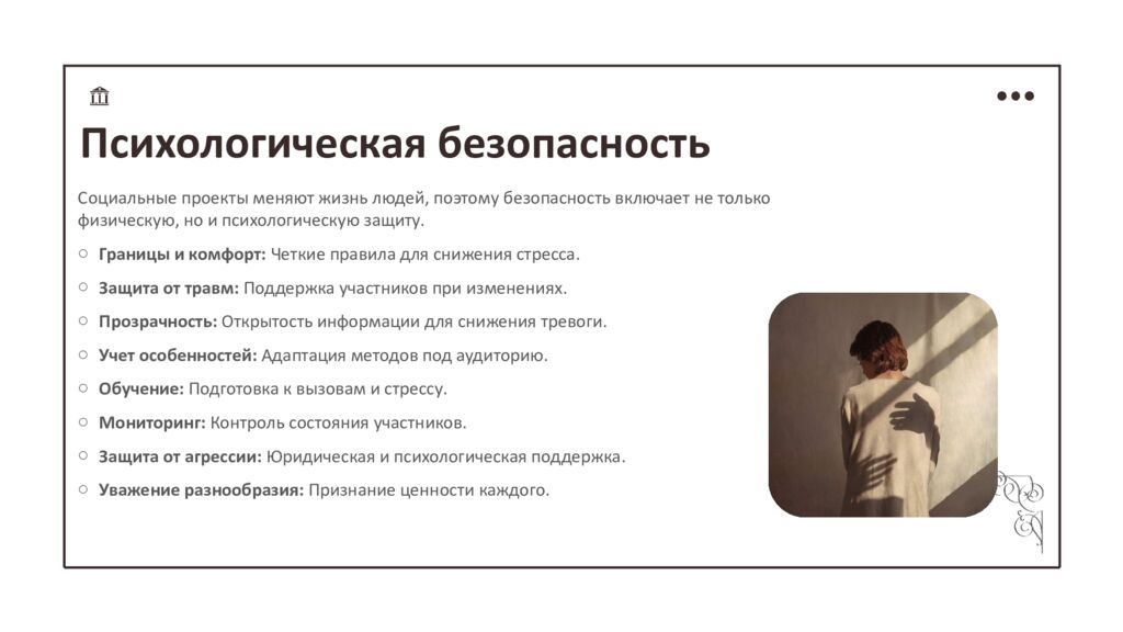 Социальные проекты меняют жизнь людей, поэтому безопасность включает не только физическую, но и психологическую защиту. Границы и комфорт: Четкие правила для снижения стресса. Защита от травм: Поддержка участников при изменениях. Прозрачность: Открытость информации для снижения тревоги. Учет особенностей: Адаптация методов под аудиторию. Обучение: Подготовка к вызовам и стрессу. Мониторинг: Контроль состояния участников. Защита от агрессии: Юридическая и психологическая поддержка. Уважение разнообразия: Признание ценности каждого. Психологическая безопасность