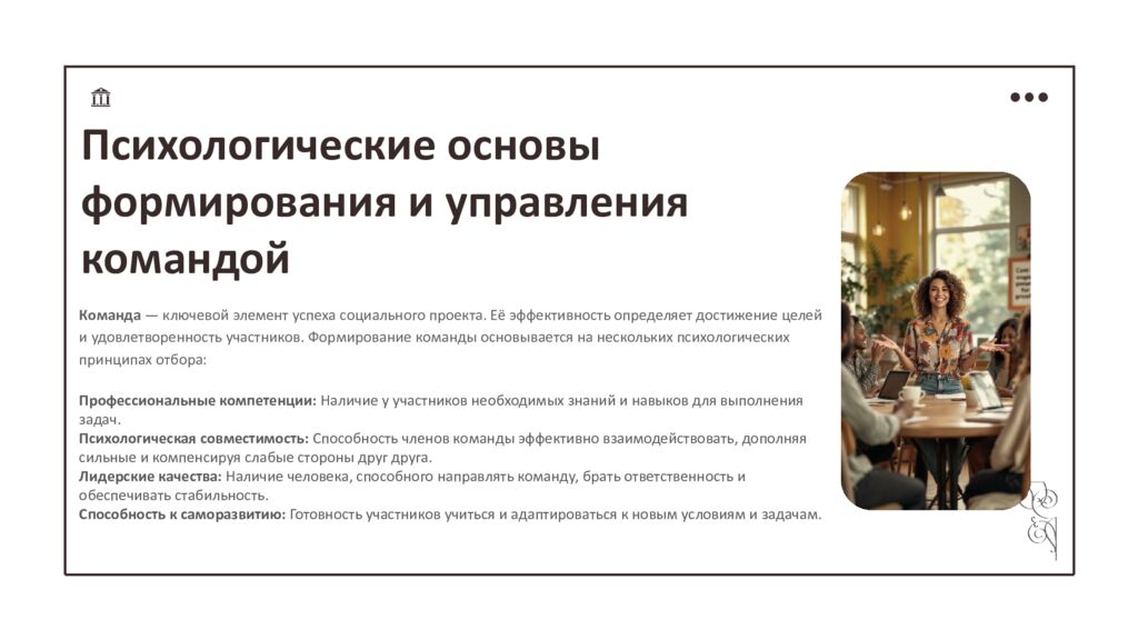 Команда — ключевой элемент успеха социального проекта. Её эффективность определяет достижение целей и удовлетворенность участников. Формирование команды основывается на нескольких психологических принципах отбора: Профессиональные компетенции: Наличие у участников необходимых знаний и навыков для выполнения задач. Психологическая совместимость: Способность членов команды эффективно взаимодействовать, дополняя сильные и компенсируя слабые стороны друг друга. Лидерские качества: Наличие человека, способного направлять команду, брать ответственность и обеспечивать стабильность. Способность к саморазвитию: Готовность участников учиться и адаптироваться к новым условиям и задачам. Психологические основы формирования и управления командой