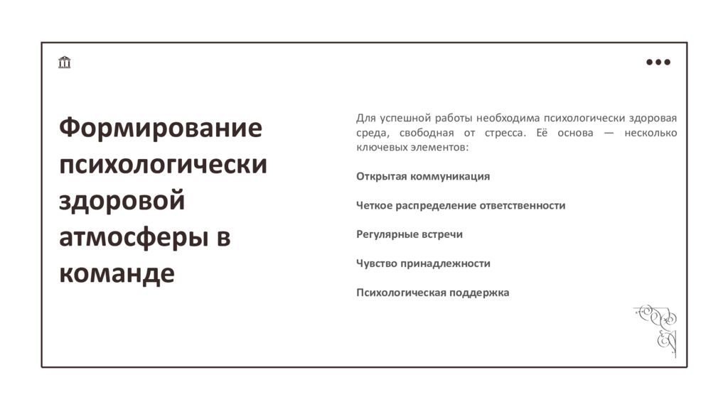Для успешной работы необходима психологически здоровая среда, свободная от стресса. Её основа — несколько ключевых элементов : Открытая коммуникация Четкое распределение ответственности Регулярные встречи Чувство принадлежности Психологическая поддержка Формирование психологически здоровой атмосферы в команде