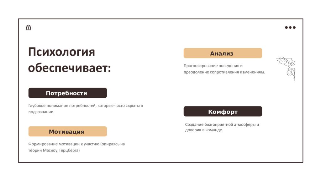 Мотивация Анализ Потребности Формирование мотивации к участию (опираясь на теории Маслоу, Герцберга ) Прогнозирование поведения и преодоление сопротивления изменениям. Глубокое понимание потребностей, которые часто скрыты в подсознании. Психология обеспечивает: Создание благоприятной атмосферы и доверия в команде. Комфорт