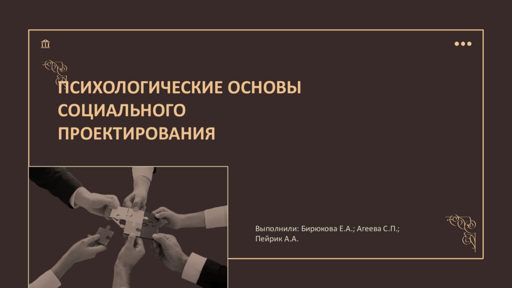 ПСИХОЛОГИЧЕСКИЕ ОСНОВЫ СОЦИАЛЬНОГО ПРОЕКТИРОВАНИЯ Выполнили: Бирюкова Е.А.; Агеева С.П.; Пейрик А.А.