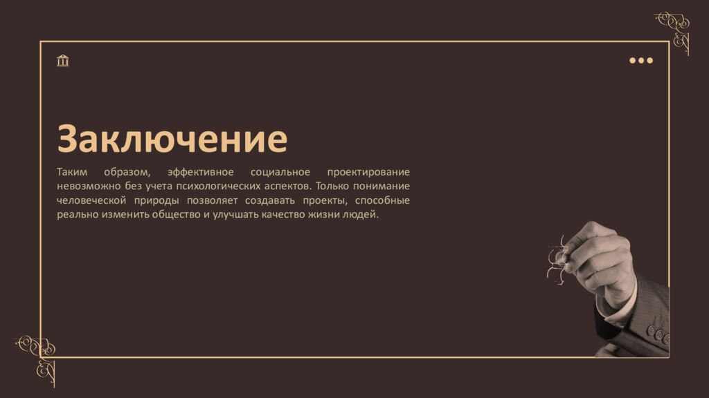 Заключение Таким образом, эффективное социальное проектирование невозможно без учета психологических аспектов. Только понимание человеческой природы позволяет создавать проекты, способные реально изменить общество и улучшать качество жизни людей.