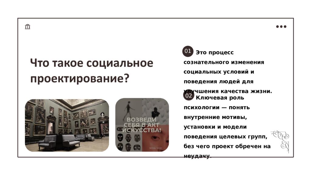 Это процесс сознательного изменения социальных условий и поведения людей для улучшения качества жизни. Ключевая роль психологии — понять внутренние мотивы, установки и модели поведения целевых групп, без чего проект обречен на неудачу. 01 02 Что такое социальное проектирование?