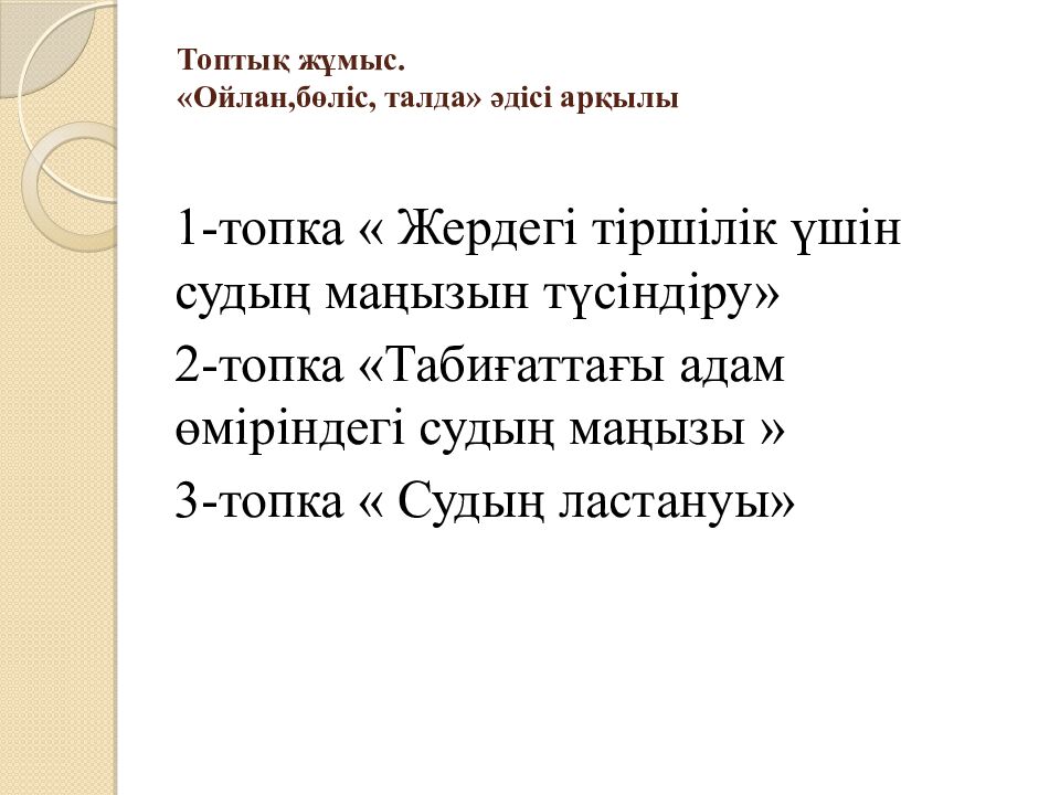 1-топка « Жердегі тіршілік үшін судың маңызын түсіндіру» 2-топка «Табиғаттағы адам өміріндегі судың маңызы » 3-топка « Судың ластануы»