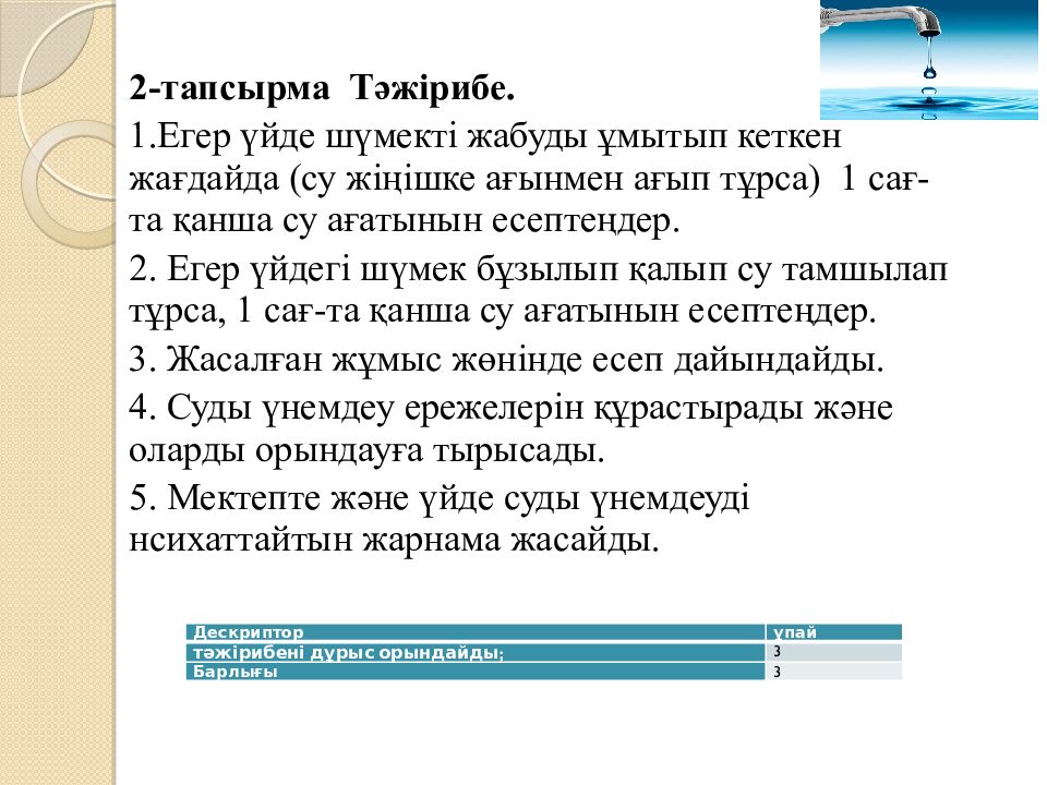 2-тапсырма Тәжірибе. 1.Егер үйде шүмекті жабуды ұмытып кеткен жағдайда (су жіңішке ағынмен ағып тұрса) 1 сағ-та қанша су ағатынын есептеңдер. 2. Егер үйдегі шүмек бұзылып қалып су тамшылап тұрса, 1 сағ-та қанша су ағатынын есептеңдер. 3. Жасалған жұмыс жөнінде есеп дайындайды. 4. Суды үнемдеу ережелерін құрастырады және оларды орындауға тырысады. 5. Мектепте және үйде суды үнемдеуді нсихаттайтын жарнама жасайды. Дескриптор ұпай тәжірибені дұрыс орындайды ; 3 Барлығы 3