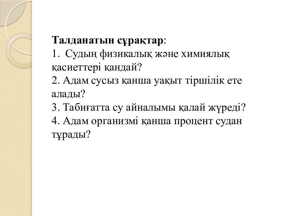 Талданатын сұрақтар : 1. Судың физикалық және химиялық қасиеттері қандай ? 2. Адам сусыз қанша уақыт тіршілік ете алады ? 3. Табиғатта су айналымы қалай жүреді ? 4. Адам организмі қанша процент судан тұрады ?