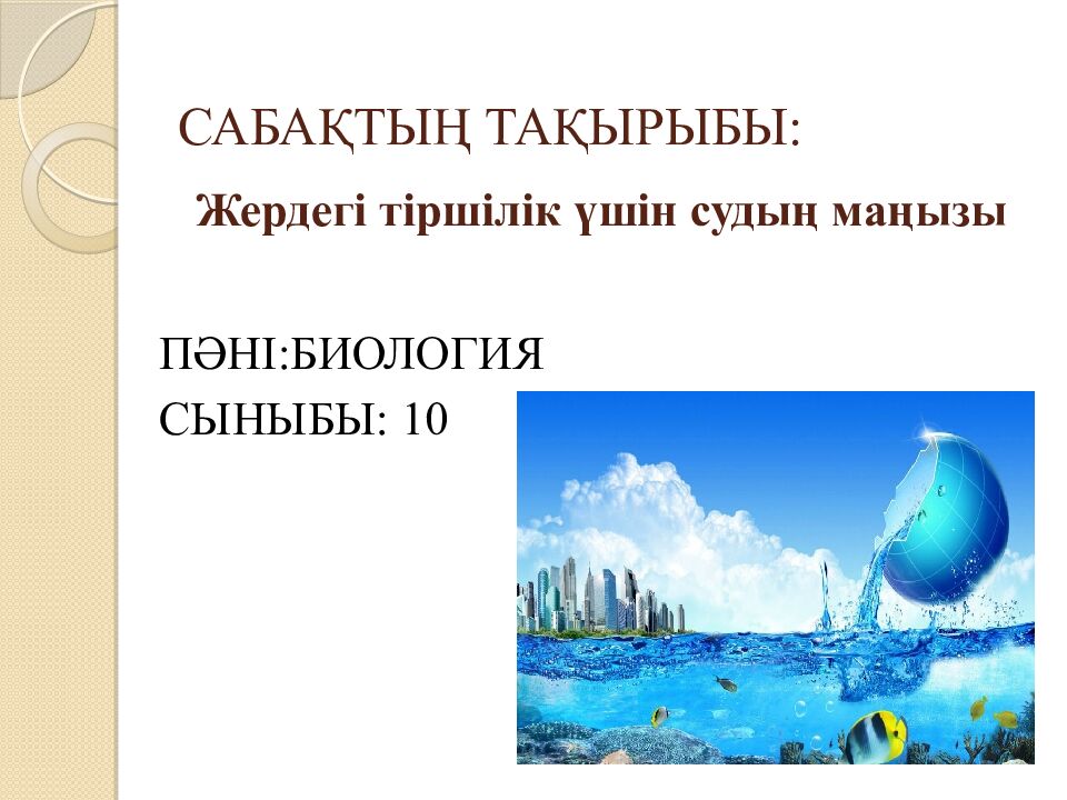 Слайд 4: САБАҚТЫҢ ТАҚЫРЫБЫ: Жердегі тіршілік үшін судың маңызы