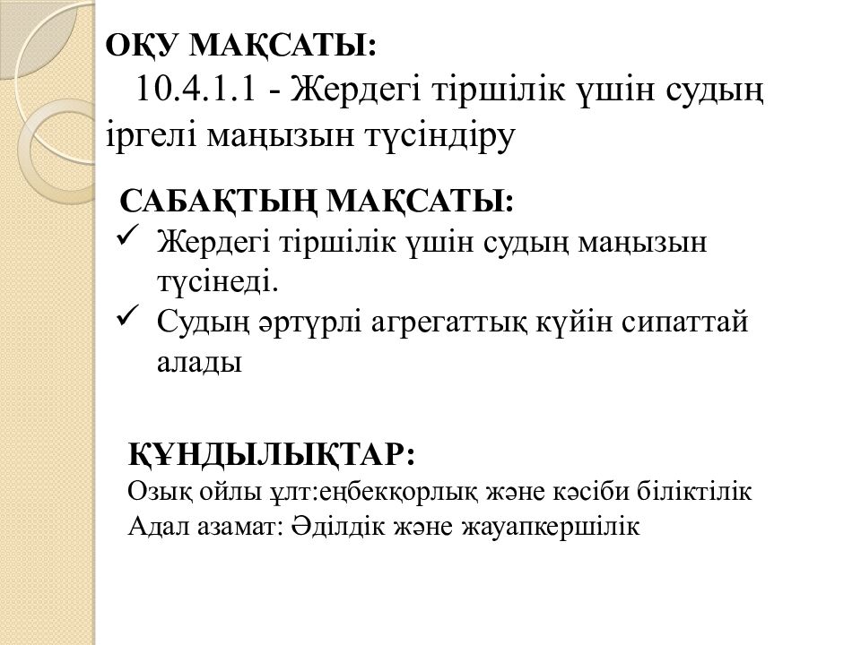 ОҚУ МАҚСАТЫ: 10.4.1.1 - Жердегі тіршілік үшін судың іргелі маңызын түсіндіру САБАҚТЫҢ МАҚСАТЫ: Жердегі тіршілік үшін судың маңызын түсінеді. Судың әртүрлі агрегаттық күйін сипаттай алады ҚҰНДЫЛЫҚТАР: Озық ойлы ұлт:еңбекқорлық және кәсіби біліктілік Адал азамат: Әділдік және жауапкершілік