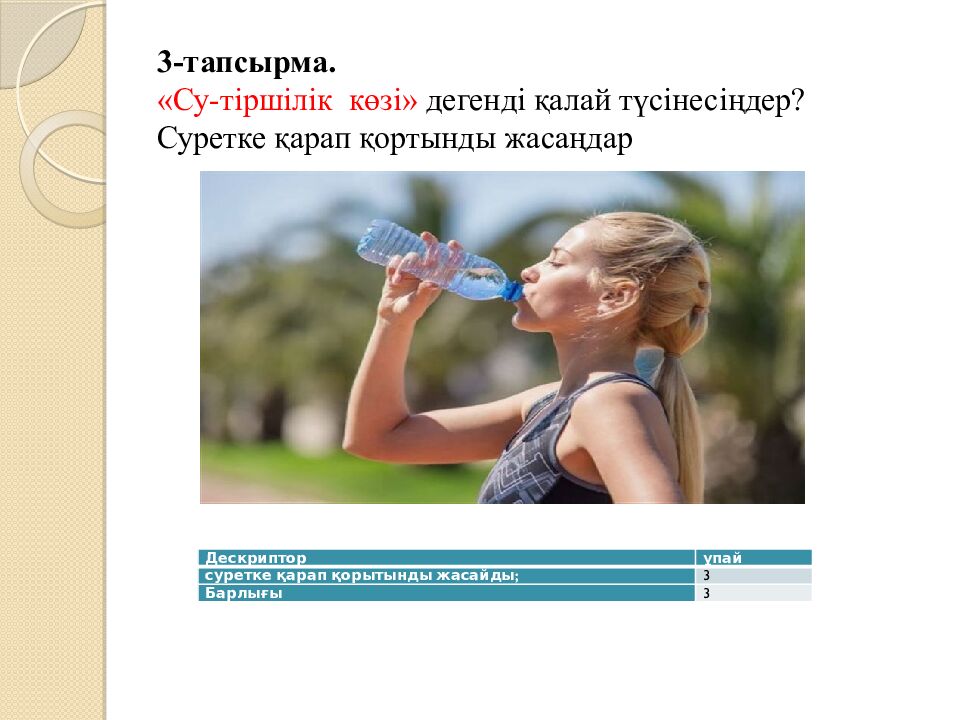 3-тапсырма. « Су-тіршілік көзі» дегенді қалай түсінесіңдер? Суретке қарап қортынды жасаңдар Дескриптор ұпай суретке қарап қорытынды жасайды; 3 Барлығы 3