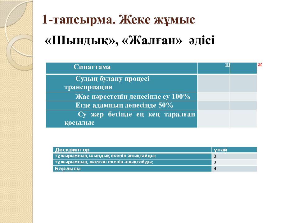 «Шындық», «Жалған» әдісі Сипаттама Ш Ж Судың булану процесі трансприация Жас нәрестенің денесінде су 100% Егде адамның денесінде 50% Су жер бетінде ең кең таралған қосылыс Дескриптор ұпай тұжырымның шындық екенін анықтайды; 2 тұжырымның жалған екенін анықтайды; 2 Барлығы 4