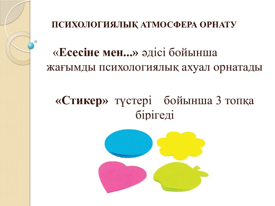 ПСИХОЛОГИЯЛЫ Қ АТМОСФЕРА ОРНАТУ « Есесіне мен...» әдісі бойынша жағымды психологиялық ахуал орнатады «Стикер » түстері бойынша 3 топқа бірігеді