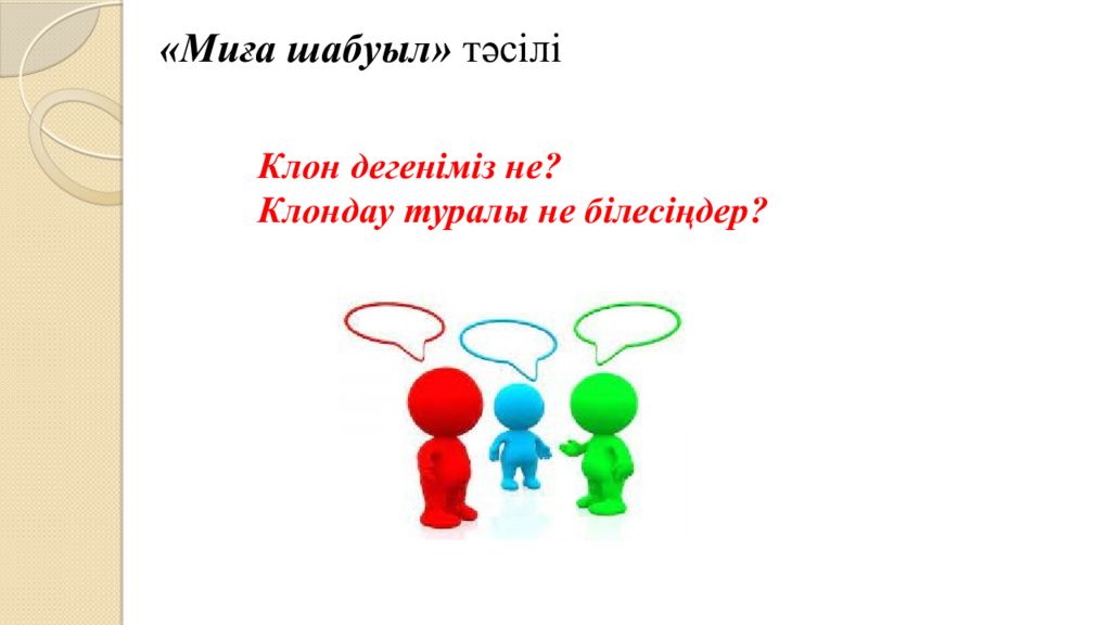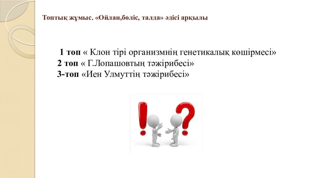 1 топ « Клон тірі организмнің генетикалық көшірмесі» 2 топ « Г.Лопашовтың тәжірибесі» 3-топ «Иен Улмуттің тәжірибесі»
