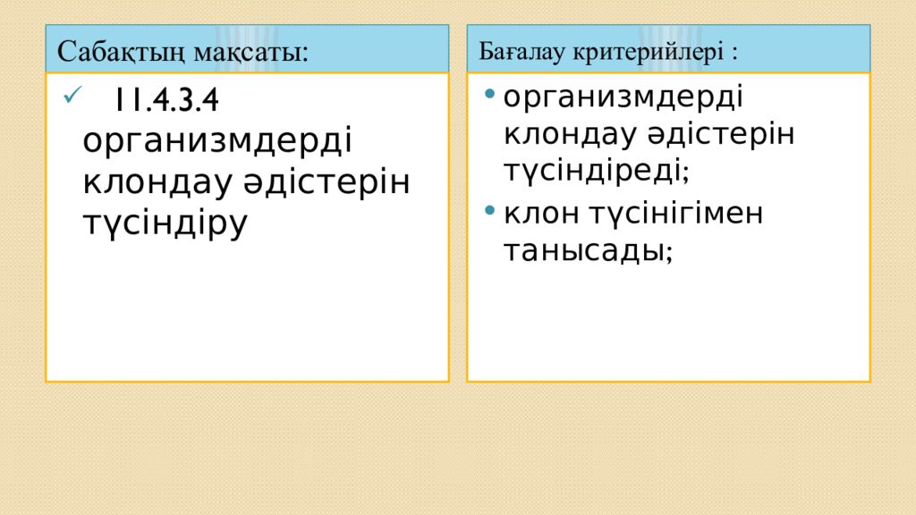Сабақтың мақсаты: Бағалау критерийлері : 11.4.3.4 организмдерді клондау әдістерін түсіндіру организмдерді клондау әдістерін түсіндіреді; клон түсінігімен танысады;