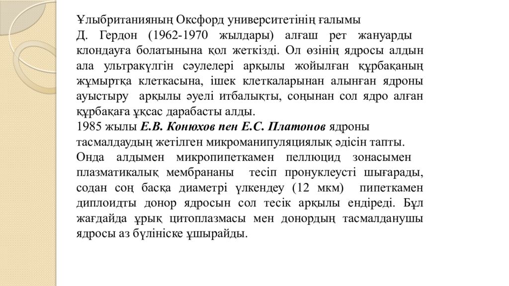 Ұлыбританияның Оксфорд университетінің ғалымы Д. Гердон (1962-1970 жылдары) алғаш рет жануарды клондауға болатынына қол жеткізді. Ол өзінің ядросы алдын ала ультракүлгін сәулелері арқылы жойылған құрбақаның жұмыртқа клеткасына, ішек клеткаларынан алынған ядроны ауыстыру арқылы әуелі итбалықты, соңынан сол ядро алған құрбақаға ұқсас дарабасты алды. 1985 жылы Е.В. Конюхов пен Е.С. Платонов ядроны тасмалдаудың жетілген микроманипуляциялық әдісін тапты. Онда алдымен микропипеткамен пеллюцид зонасымен плазматикалық мембрананы тесіп пронуклеусті шығарады, содан соң басқа диаметрі үлкендеу (12 мкм) пипеткамен диплоидты донор ядросын сол тесік арқылы ендіреді. Бұл жағдайда ұрық цитоплазмасы мен донордың тасмалданушы ядросы аз бүлініске ұшырайды.