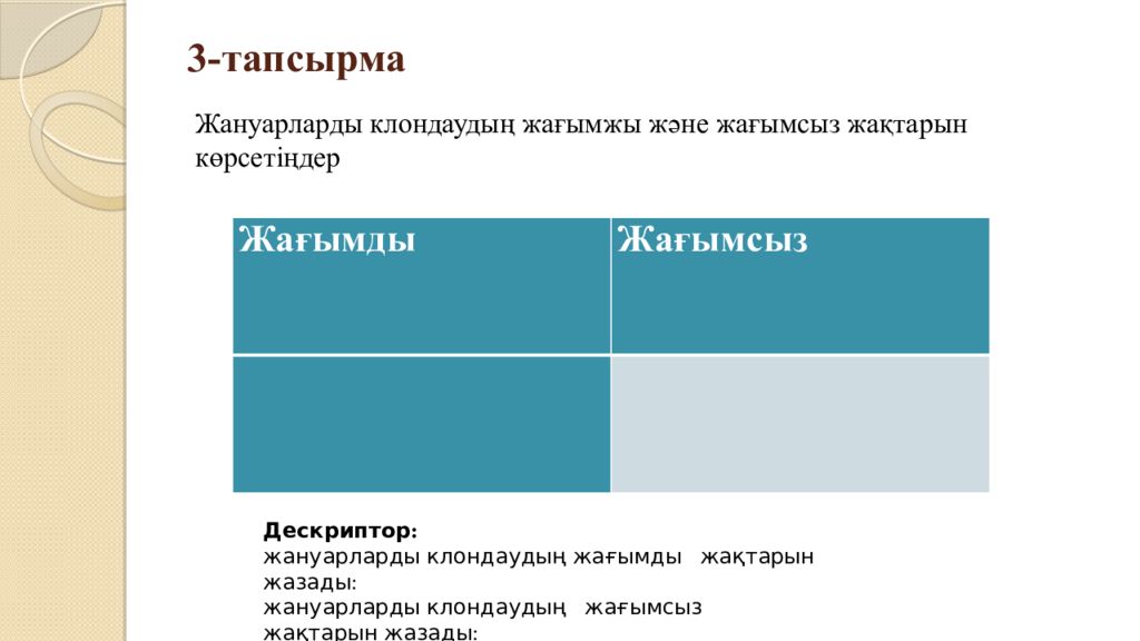 Жануарларды клондаудың жағымжы және жағымсыз жақтарын көрсетіңдер Жағымды Жағымсыз Дескриптор: жануарларды клондаудың жағымды жақтарын жазады: жануарларды клондаудың жағымсыз жақтарын жазады: Жалпы балл-2