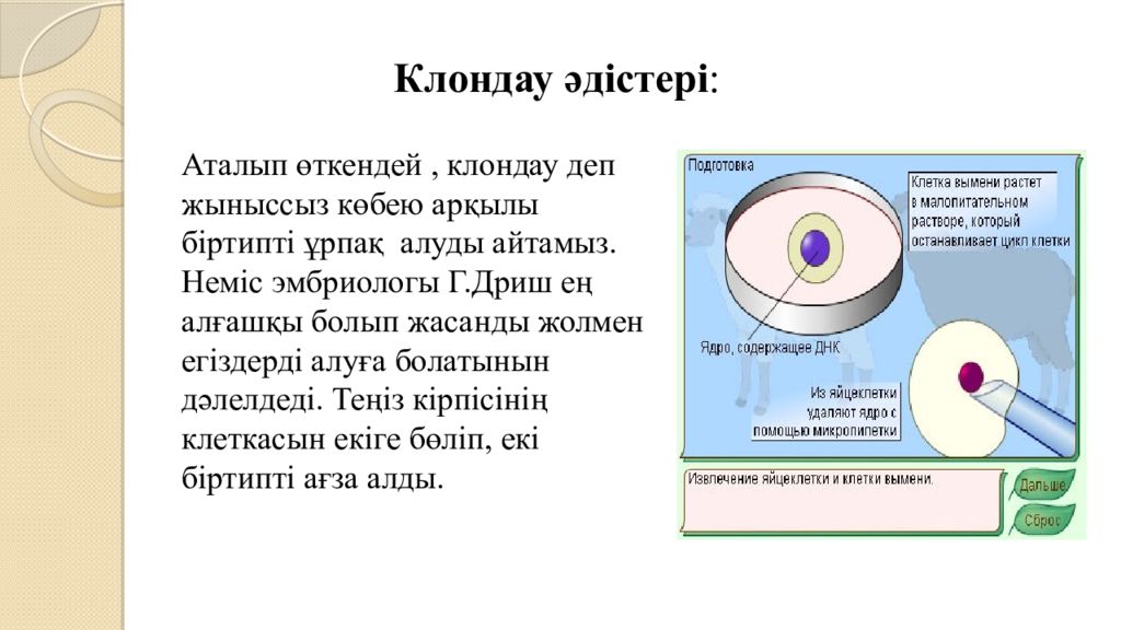 Клондау әдістері : Аталып өткендей, клондау деп жыныссыз көбею арқылы біртипті ұрпақ алуды айтамыз. Неміс эмбриологы Г.Дриш ең алғашқы болып жасанды жолмен егіздерді алуға болатынын дәлелдеді. Теңіз кірпісінің клеткасын екіге бөліп, екі біртипті ағза алды.