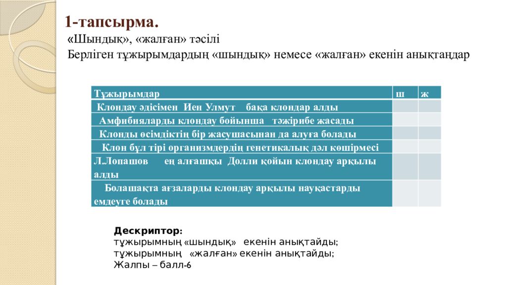 Тұжырымдар ш ж Клондау әдісімен Иен Улмут бақа клондар алды Амфибияларды клондау бойынша тәжірибе жасады Клонды өсімдіктің бір жасушасынан да алуға болады Клон бұл тірі организмдердің генетикалық дәл көшірмесі Л.Лопашов ең алғашқы Долли қойын клондау арқылы алды Болашақта ағзаларды клондау арқылы науқастарды емдеуге болады Дескриптор: тұжырымның «шындық» екенін анықтайды; тұжырымның «жалған» екенін анықтайды; Жалпы – балл-6