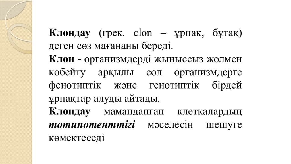 Клондау (грек. clon – ұрпақ, бұтақ) деген сөз мағананы береді. Клон - организмдерді жыныссыз жолмен көбейту арқылы сол организмдерге фенотиптік және генотиптік бірдей ұрпақтар алуды айтады. Клондау маманданған клеткалардың тотипотенттігі мәселесін шешуге көмектеседі