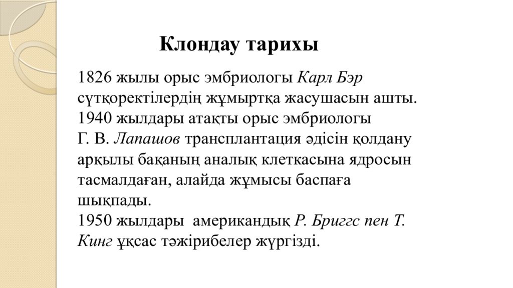 1826 жылы орыс эмбриологы Карл Бэр сүтқоректілердің жұмыртқа жасушасын ашты. 1940 жылдары атақты орыс эмбриологы Г. В. Лапашов трансплантация әдісін қолдану арқылы бақаның аналық клеткасына ядросын тасмалдаған, алайда жұмысы баспаға шықпады. 1950 жылдары американдық Р. Бриггс пен Т. Кинг ұқсас тәжірибелер жүргізді. Клондау тарихы