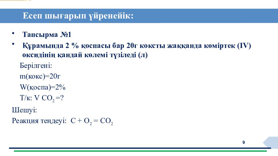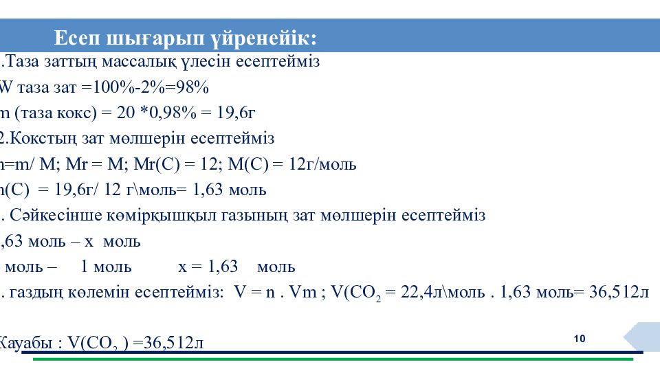9 Есеп шығарып үйренейік: Тапсырма №1 Құрамында 2 % қоспасы бар 20г коксты жаққанда көміртек ( IV) оксидінің қандай көлемі түзіледі (л) Берілгені : m (кокс ) =20г W ( қоспа )=2% Т/к: V СО 2 =? Ш ешуі : Реакция теңдеуі : С + О 2 = СО 2