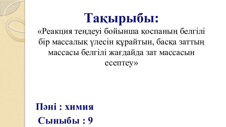 Тақырыбы: «Реакция теңдеуі бойынша қоспаның белгілі бір массалық үлесін құрайтын, басқа заттың массасы белгілі жағдайда зат массасын есептеу» Пәні : химия Сыныбы : 9