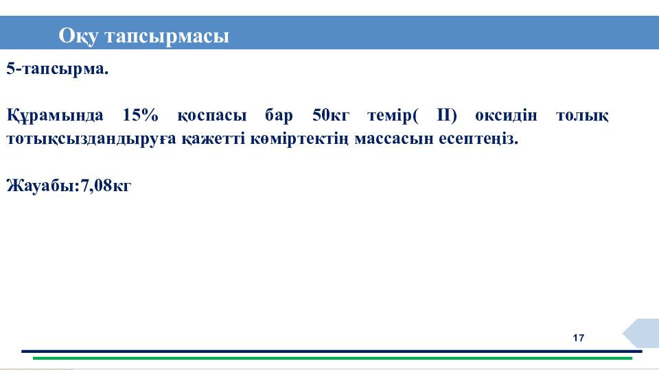 17 Оқу тапсырмасы 5-тапсырма. Құрамында 15% қоспасы бар 50кг темір( II) оксидін толық тотықсыздандыруға қажетті көміртектің массасын есептеңіз. Жауабы :7,08кг