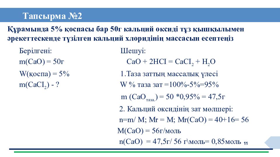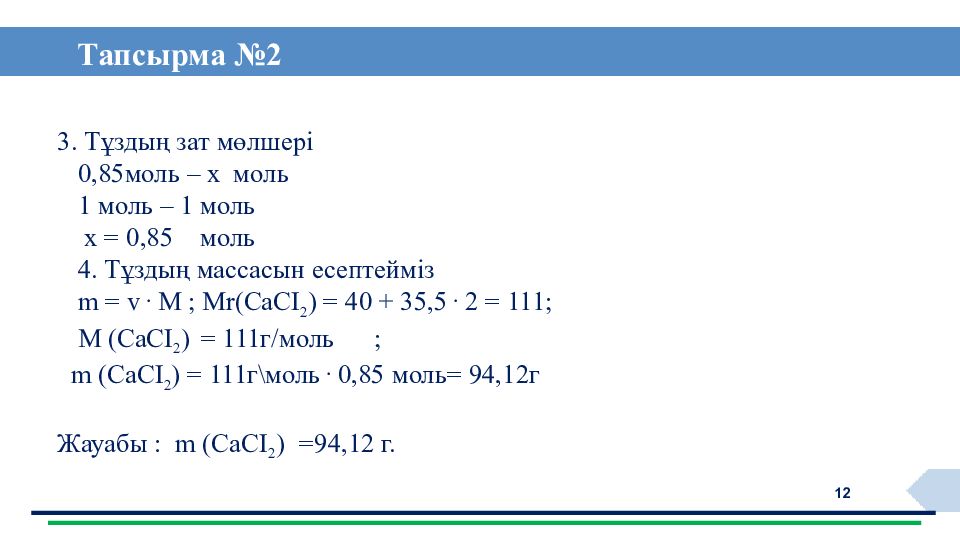 12 Тапсырма №2 3. Тұздың зат мөлшері 0,85моль – x моль 1 моль – 1 моль x = 0,85 моль 4. Тұздың массасын есептейміз m = v. M ; Mr ( CaCI 2 ) = 40 + 35,5. 2 = 111; M ( CaCI 2 ) = 111г/моль ; m ( CaCI 2 ) = 111г\моль. 0,85 моль= 94,12г Жауабы : m ( CaCI 2 ) =94,12 г.