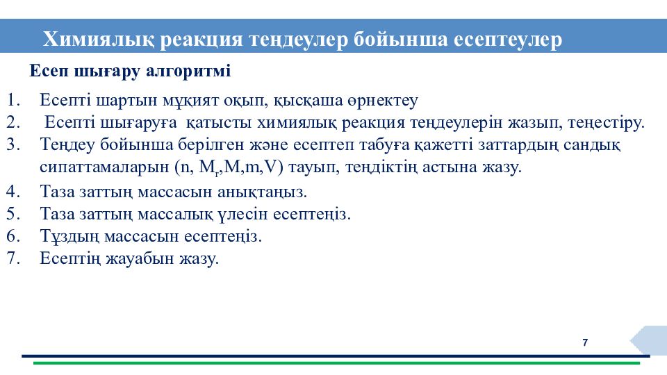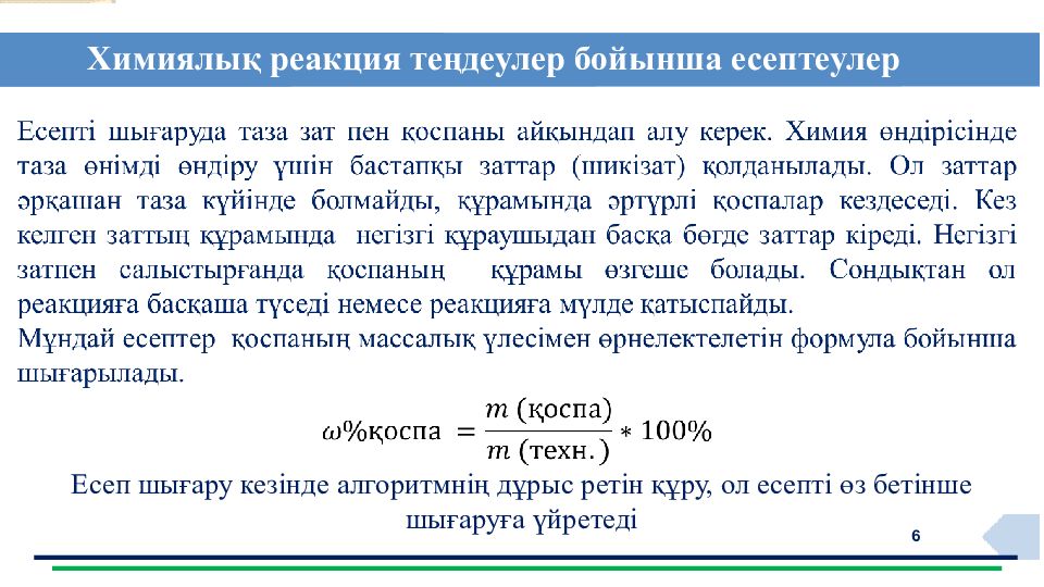 6 Химиялық реакция те ңдеулер бойынша есептеулер Есеп шығару кезінде алгоритмнің дұрыс ретін құру, ол есепті өз бетінше шығаруға үйретеді