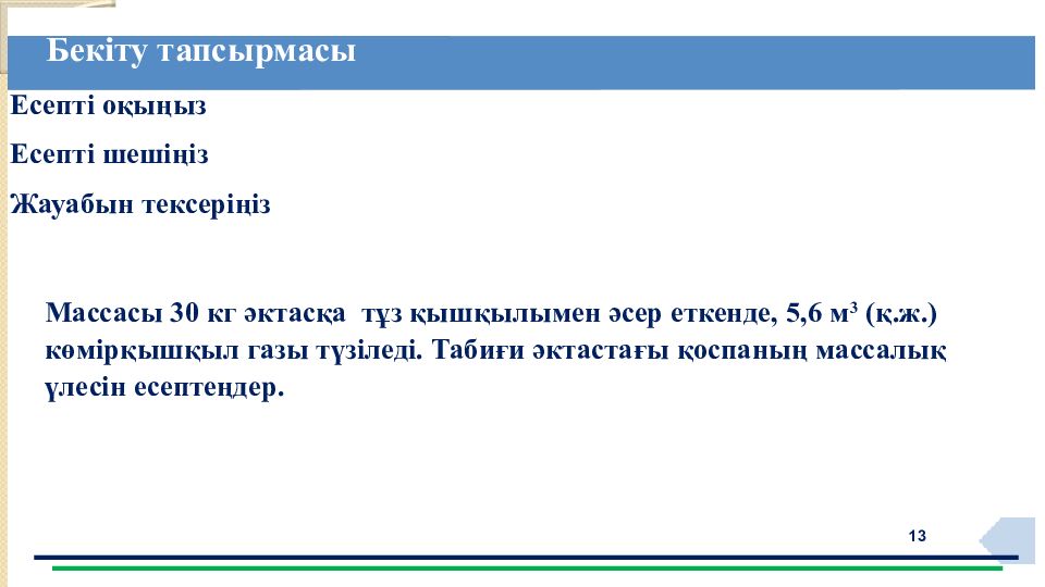 13 Тапсырма №2 Е септі оқыңыз Есепті шешіңіз Жауабын тексеріңіз Бекіту тапсырмасы Массасы 30 кг әктасқа тұз қышқылымен әсер еткенде, 5,6 м 3 (қ.ж.) көмірқышқыл газы түзіледі. Табиғи әктастағы қоспаның массалық үлесін есептеңдер.