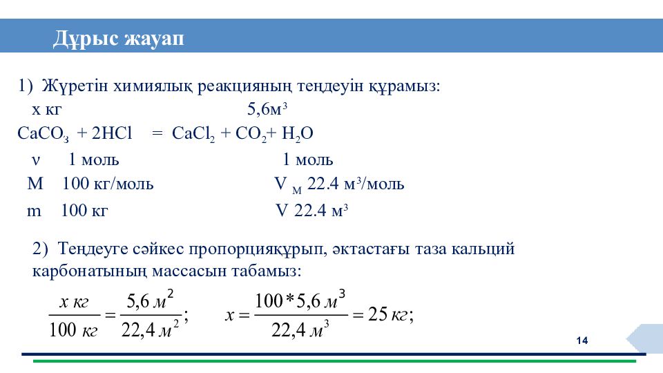 14 Дұрыс жауап Жүретін химиялық реакцияның теңдеуін құрамыз: х кг 5,6м 3 СаСО З + 2НС l = СаС l 2 + СО 2 + Н 2 О ν 1 моль 1 моль М 100 кг/моль V M 22.4 м 3 /моль m 100 кг V 22.4 м 3 2) Теңдеуге сәйкес пропорцияқұрып, әктастағы таза кальций карбонатының массасын табамыз:
