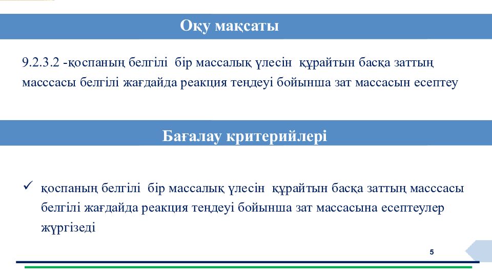 5 9.2.3.2 - қоспаның белгілі бір массалық үлесін құрайтын басқа заттың масссасы белгілі жағдайда реакция теңдеуі бойынша зат массасын есептеу Оқу мақсаты Ба ғалау критерийлері қоспаның белгілі бір массалық үлесін құрайтын басқа заттың масссасы белгілі жағдайда реакция теңдеуі бойынша зат массасына есептеулер жүргізеді