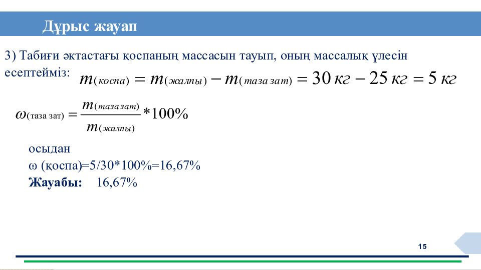 15 Дұрыс жауап 3) Табиғи әктастағы қоспаның массасын тауып, оның массалық үлесін есептейміз: осыдан ω (қоспа) =5/30*100%=16,67% Жауабы: 16,67%