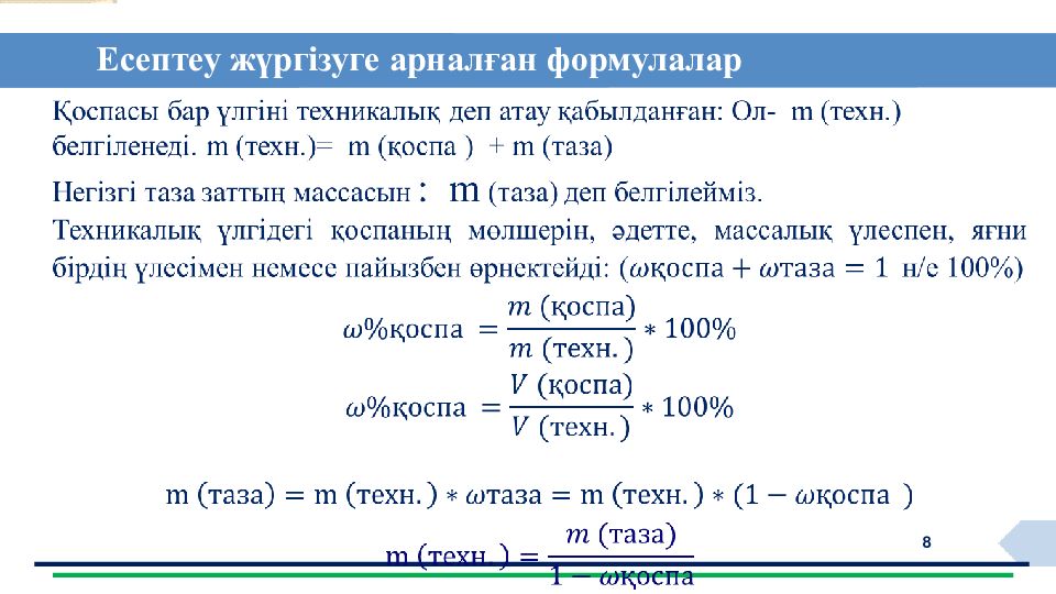 7 Химиялық реакция те ңдеулер бойынша есептеулер Есеп шығару алгоритмі Есепті шартын мұқият оқып, қысқаша өрнектеу Есепті шығаруға қатысты химиялық реакция теңдеулерін жазып, теңестіру. Теңдеу бойынша берілген және есептеп табуға қажетті заттардың сандық сипаттамаларын (n, M r,M,m,V) тауып, теңдіктің астына жазу. Таза заттың массасын анықтаңыз. Таза заттың массалық үлесін есептеңіз. Тұздың массасын есептеңіз. Есептің жауабын жазу.