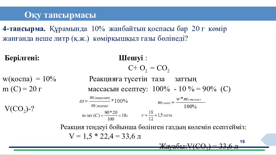 10 Есеп шығарып үйренейік: 1.Таза заттың массалық үлесін есептейміз W таза зат =100%-2%=98% m ( таза кокс) = 20 *0,98% = 19,6г 2.Кокстың зат мөлшерін есептейміз n=m/ M; Mr = M; Mr (C) = 12; M(C) = 12 г/моль n(C) = 19,6 г/ 12 г\моль= 1,63 моль 3. Сәйкесінше көмірқышқыл газының зат мөлшерін есептейміз 1,63 моль – x моль 1 моль – 1 моль x = 1,63 моль 4. газдың көлемін есептейміз : V = n. Vm ; V ( СО 2 = 22,4 л\моль. 1,63 моль= 36,512л Жауабы : V ( СО 2 ) =36,512 л