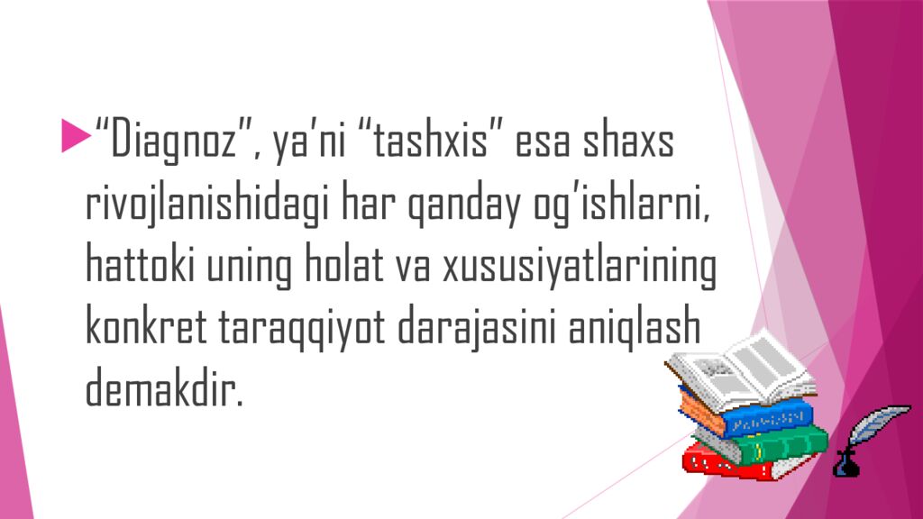 “ Diagnoz ”, ya’ni “ tashxis ” esa shaxs rivojlanishidagi har qanday og’ishlarni, hattoki u ning holat va xususiyatlarining konkret taraqqiyot darajasini aniqlash demakdir.